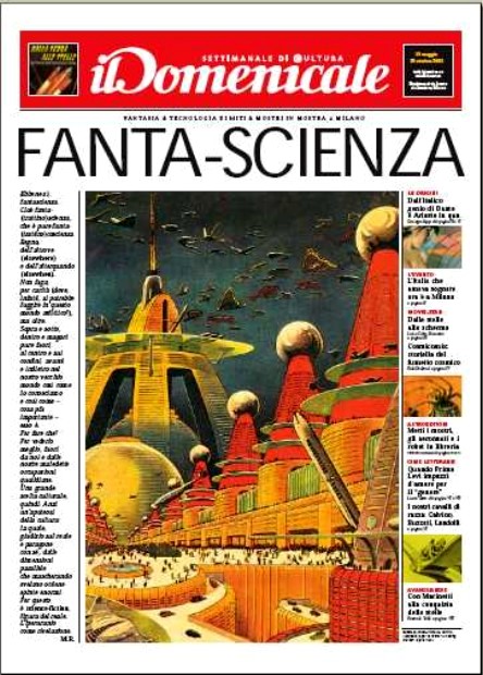 cop. ripr. Il Domenicale. Settimanale di Cultura [M1001] (EV) Ca, dim. [hxl]: 530x380, Batt.xrighe: varie, pagg.: VIII, [omaggio] [/] -9 lug 2005 [regalo di Clerici] p. II Viaggio alle origini di un'utopia // Giuseppe LIPPI ill. ripr. [continua a p. III] p. II Nella mostra di via Senato c'è tanta Italia che amava sognare // G. R. p. III SF al cinema: made in Italy ossia fai da te // Luisa Cotta RAMOSINO p. IV S-F Comix: in Italia anzitutto import. Però... // Rick DECKARD p. IV Sa qui all'ubiquità // Vittorio CURTONI p. V Il primo che nobilitò le fantastoria, Calvino ill. foto p. V Ma è Buzzati il solo maestro italico della SF p. V E Landolfi, l'eccentrico per antonomasia ill. foto, ripr. p. VI Mica male quel Damiano Malabaila. Sfido, era nientemeno che Primo Levi // Laura SERRA [continua a p. VII] p. VII Un occhio al Futurismo // Riccardo VALLA ill. ripr. p. VII Dal primo editoriale di "Amazing Stories", aprile 1926 // Hugo GERNSBACK tr. non indicato, ill. ripr. p. VII Luciano, il primo, il solo